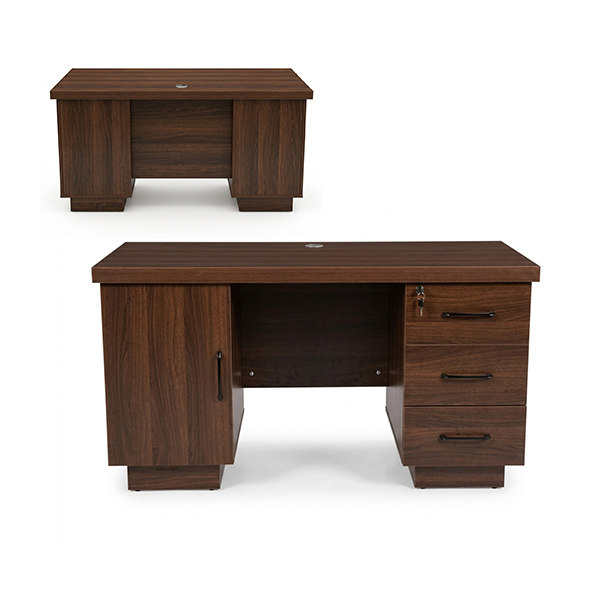 - Design: Modern, classic executive style with a central modesty panel and two side pedestals.
